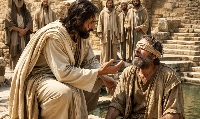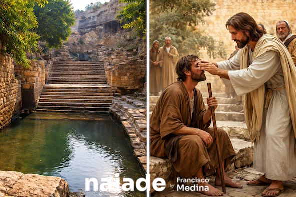 Jesus faz algo incomum: mistura saliva com terra, passa nos olhos do homem e dá uma instrução simples: Vai até a Piscina de Siloé e lava os olhos.