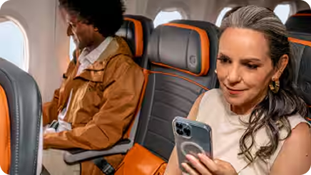 O grande diferencial já começa no espaço. As poltronas têm maior reclinação, mais distância entre os assentos e apoio para as pernas, o que faz bastante diferença em voos mais longos, principalmente para destinos como Caribe e América do Norte.