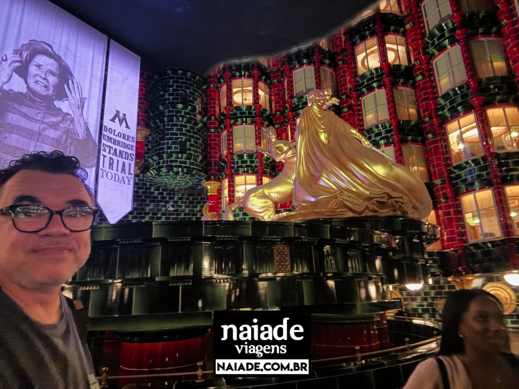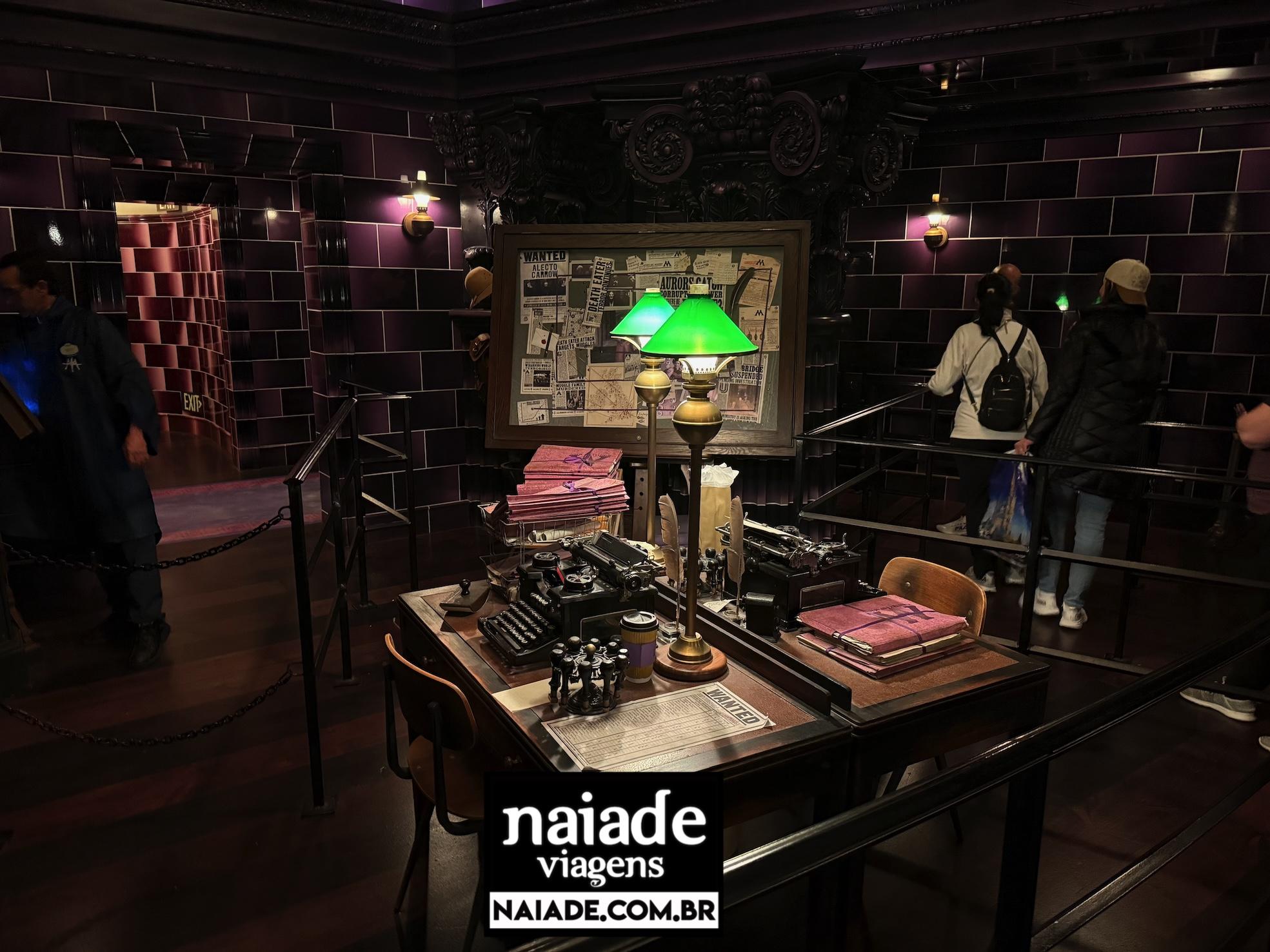 Você entra e já sente que está saindo do mundo comum. A proposta é que você acesse o Ministério pelo Métro-Floo (uma espécie de metrô mágico/portal), com uma ambientação bem “Londres subterrânea”: azulejos, sinalização e clima de estação.