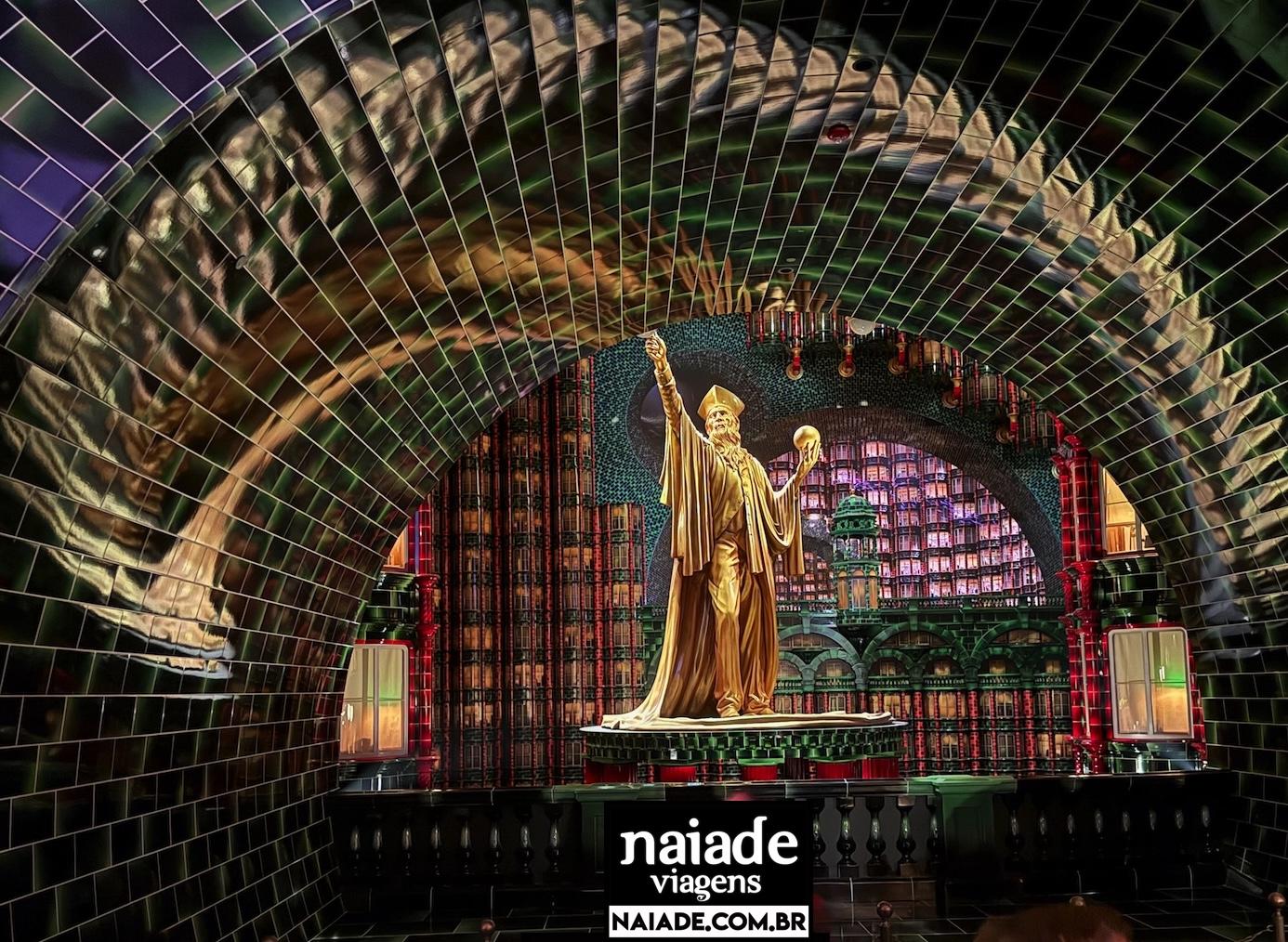 Ao longo do caminho aparecem elementos vivos do universo Potter: retratos que falam e uma estátua encantada que interage de forma bem marcante (um dos momentos que mais “quebra” a sensação de espera).