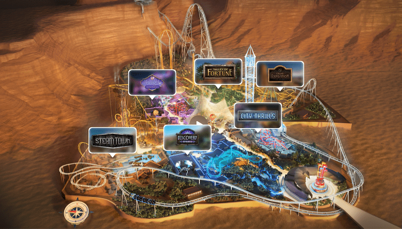 Steam Town, que se diz ser um lugar onde o passado e o futuro colidem. O Discovery Springs se concentrará na água e incluirá muitos recursos e fontes de água. Twilight Gardens se concentrará em belas folhagens que brilharão à noite. O Valley of Fortune convidará os hóspedes a experimentar a aventura enquanto exibe a arquitetura árabe. As exposições mundiais do passado serão o foco da Grande Exposição, e a Cidade das Emoções contará com a montanha-russa exclusiva do parque, Falcon’s Flight.