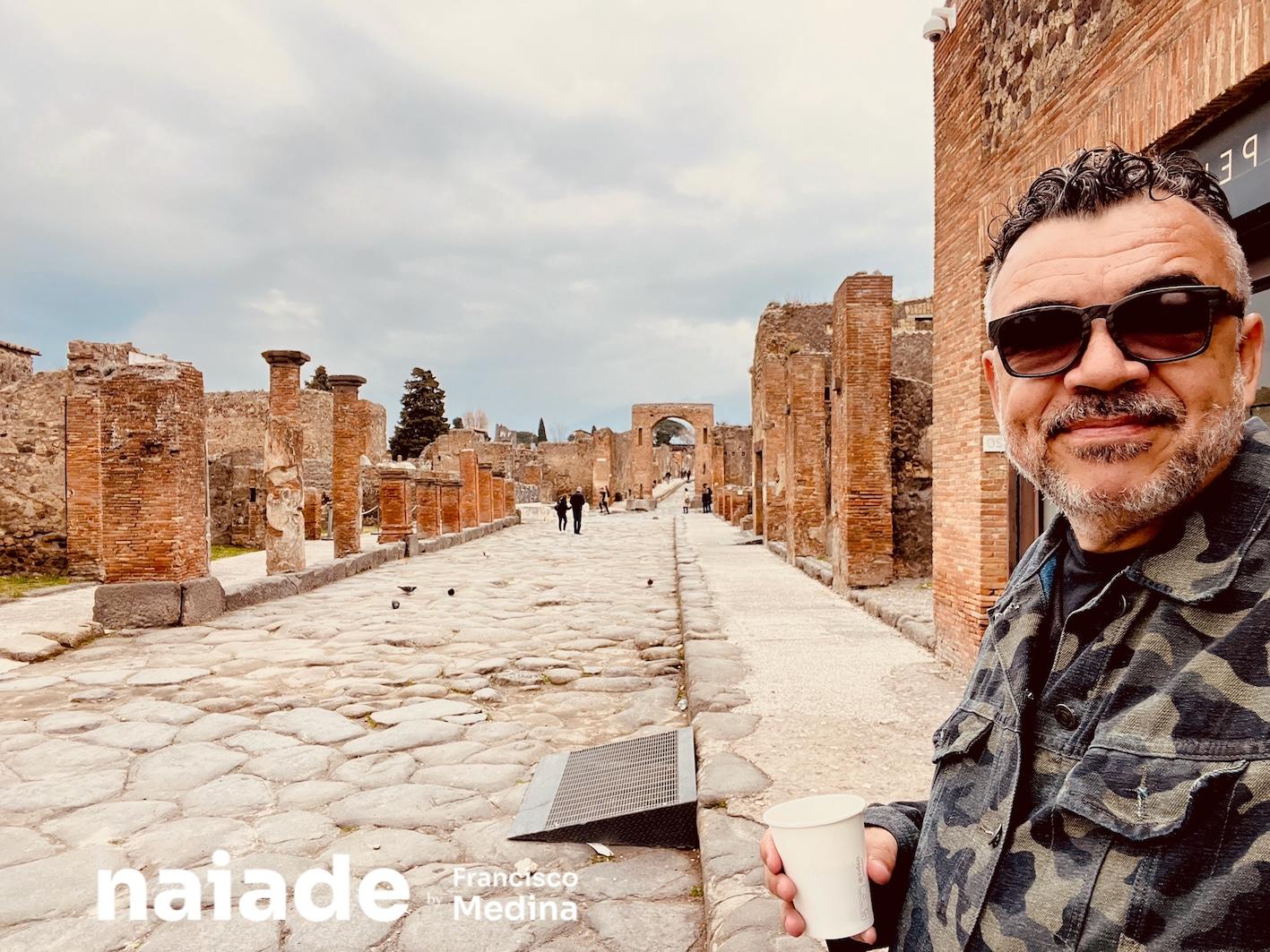 Chico diante as colunas do Templo de Venus no Fórum Romano na Itália em 2023